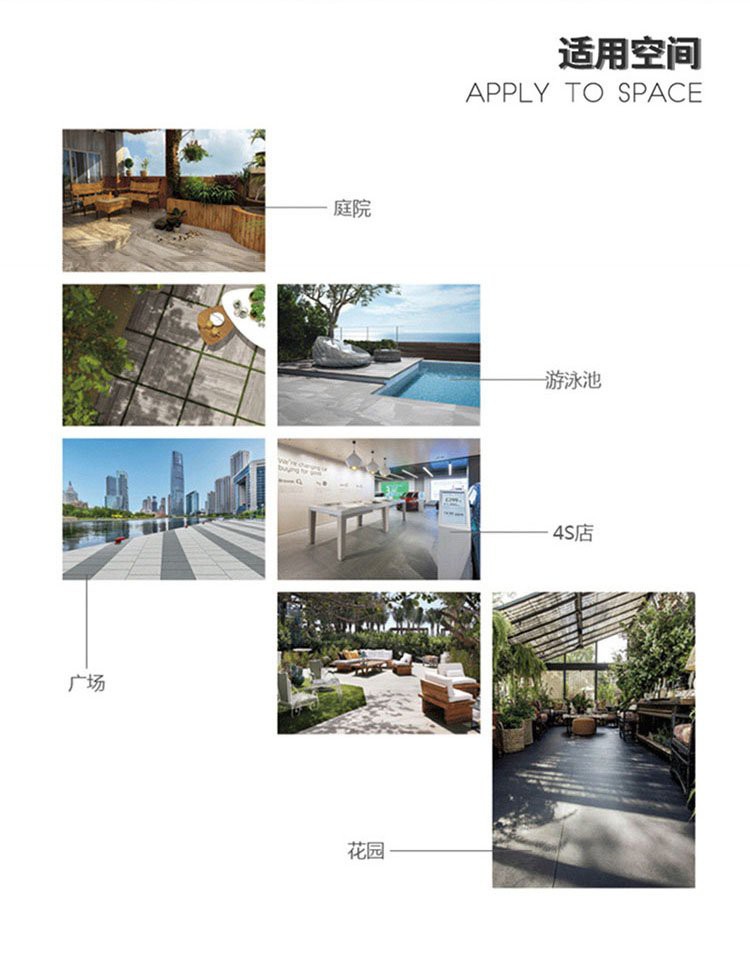 廣泛用于室內(nèi)、室外環(huán)境地面鋪裝和墻面裝飾。產(chǎn)品的適用范圍是:水上運(yùn)動(dòng)項(xiàng)目場(chǎng)館、衛(wèi)浴環(huán)境、商業(yè)娛樂場(chǎng)所、要求特殊室內(nèi)效果的酒店和家居等。